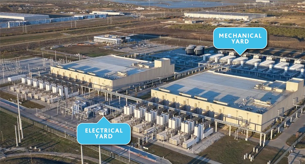 Data centers are installed next to giant substations connected to the electrical grid. Long electrical trenches run from the substation to: